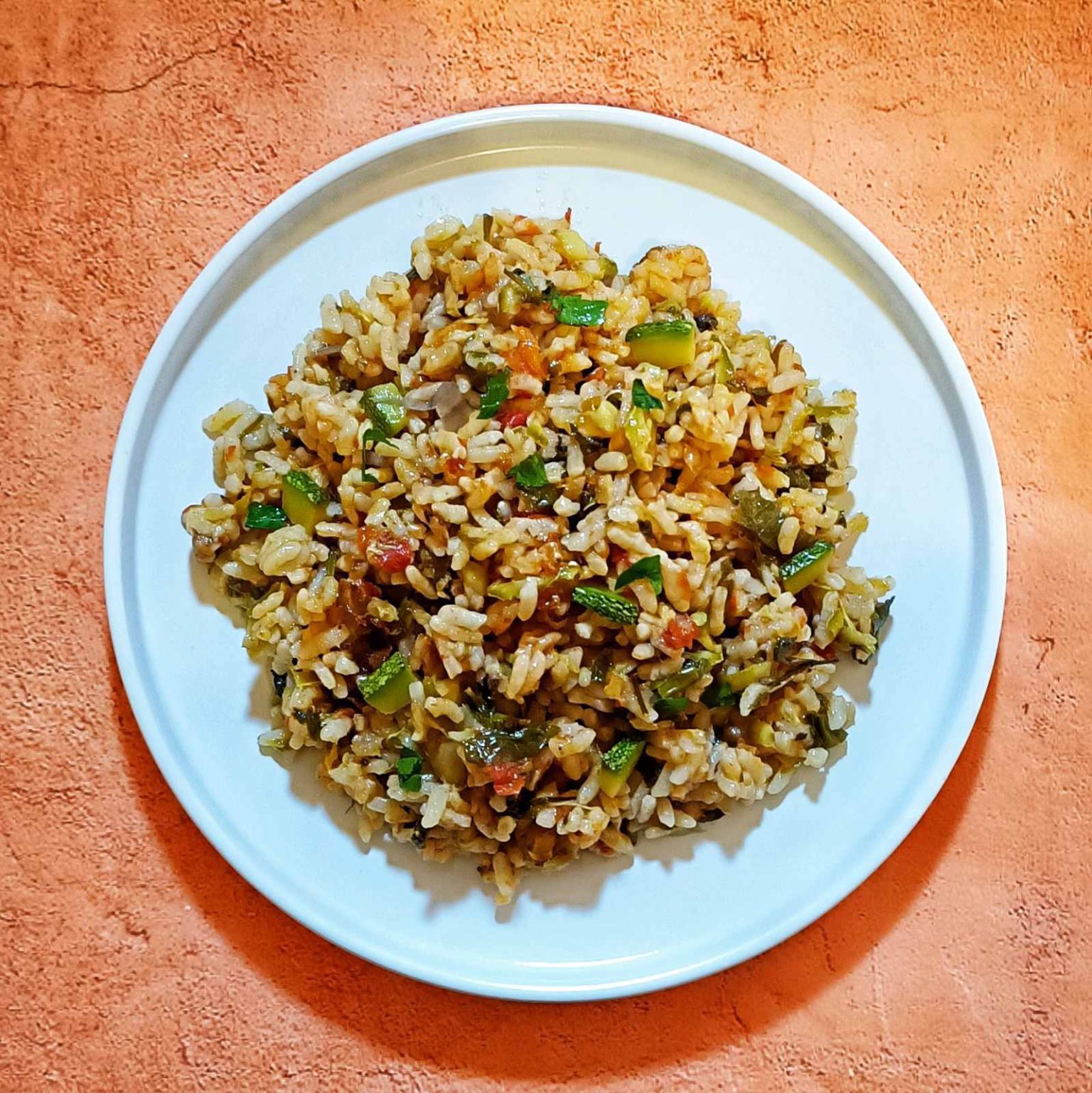 Πλένουμε, καθαρίζουμε και ετοιμάζουμε τα λαχανικά μας. Σε βαθύ τηγάνι ζεσταίνουμε 20 ml ελαιόλαδο και σοτάρουμε πρώτα τα κρεμμύδια, κατόπιν τον πελτέ, ανακατεύουμε και αποσύρουμε. Σε βαθύ δοχείο βάζουμε τα κολοκυθάκια, τις μελιτζάνες , τις πιπεριές, τις ντομάτες, όλα τριμμένα στον τρίφτη , ρίχνουμε το περιεχόμενο από το τηγάνι, προσθέτουμε το ρύζι, αλάτι και πιπέρι, τα 80 ml ελαιόλαδο, τα μυρωδικά ψιλοκομμένα, 250 ml (1 ποτήρι) νερό, ανακατεύουμε καλά και περιμένουμε για 15΄ περίπου να «σταθούν» τα υλικά. Ρίχνουμε το μείγμα σε ταψί και προσθέτουμε σιγά σιγά 500 ml (2 ποτήρια) νερό καθώς ανακατεύουμε το μείγμα. Σκεπάζουμε με λαδόκολλα και ψήνουμε σε προθερμασμένο φούρνο, στους 180 βαθμούς C, στις αντιστάσεις, πάνω & κάτω, για 20΄ με 30΄. Κατόπιν, ξεσκεπάζουμε το ταψί μας και αφήνουμε για άλλα 5΄. Αποσύρουμε, προσθέτουμε τα 50 ml ελαιόλαδο, περιμένουμε να κρυώσει το φαγητό μας, σερβίρουμε και απολαμβάνουμε!!!