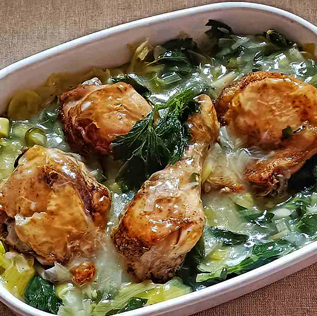 Σε ένα μεγάλο πυρέξ βάζουμε: το κοτόπουλο σε μερίδες, τα πράσα, το σέλινο, τη σελινόριζα, το ελαιόλαδο, αλάτι και πιπέρι, 1 ποτήρι νερό και σφραγίζουμε με λαδόκολλα (βρεγμένη και τσαλακωμένη).