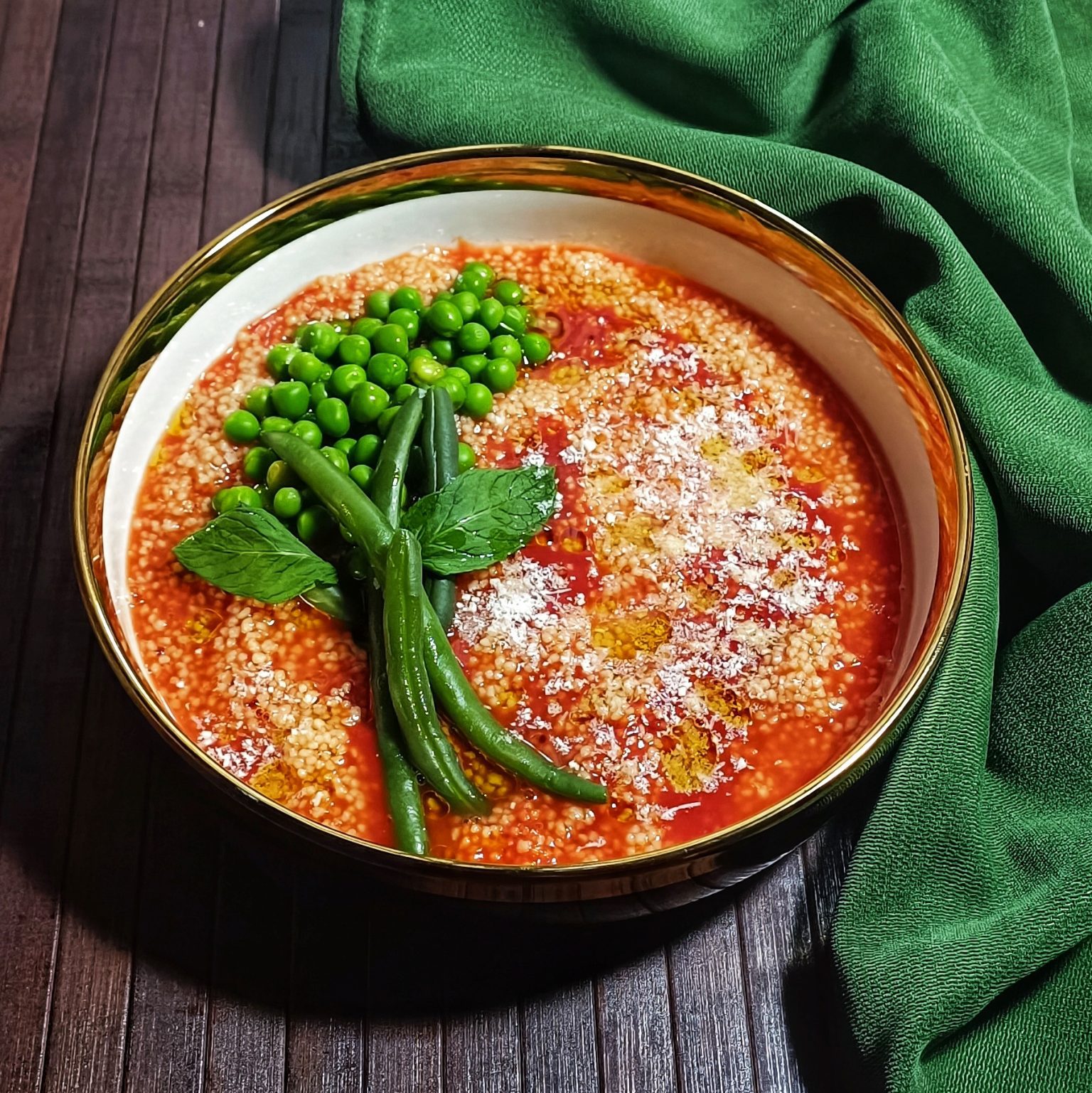 Κατόπιν, ρίχνουμε το κουσκούς μέσα στη σούπα και ενσωματώνουμε.