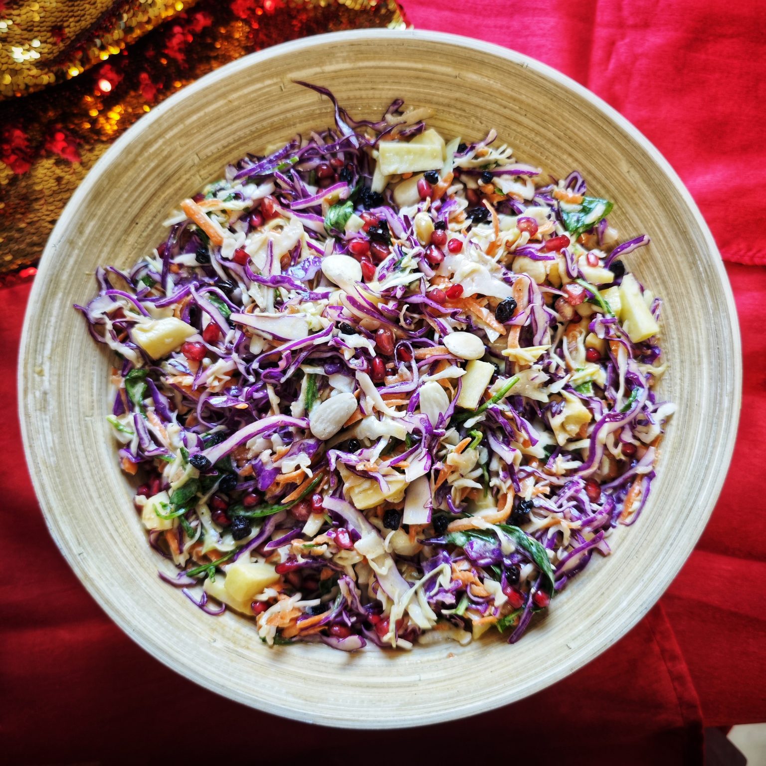 Πλένουμε, στεγνώνουμε και κόβουμε τα λαχανικά μας (άσπρο & κόκκινο λάχανο, καρότο, ρόκα, μαϊντανό). Καθαρίζουμε και κόβουμε το μήλο. Ετοιμάζουμε το ρόδι, αν δεν το πάρουμε έτοιμο καθαρισμένο.